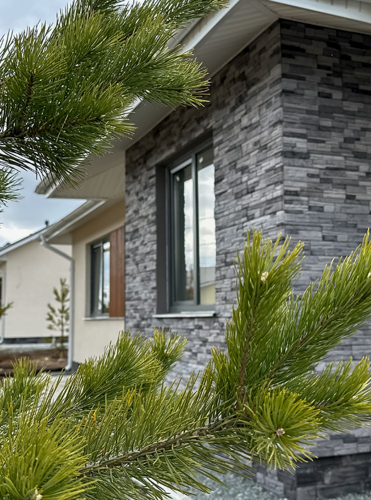 Котельная с водоподготовкой и теплыми полами, электропроводка, машинное оштукатуривание стен и полусухая стяжка пола; окна и витражи из ламинированного 70 мм профиля, двухкамерный стеклопакет с двумя «умными» стеклами; крытая терраса из ДПК; крыльцо с отделкой плиткой.